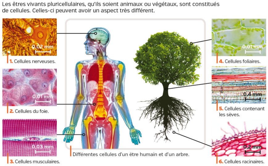 D’autres organismes vivants sont composés de plusieurs cellules, ce sont des organismes pluricellulaires (ex : l’Homme, les vers de terre, les jacinthes…)