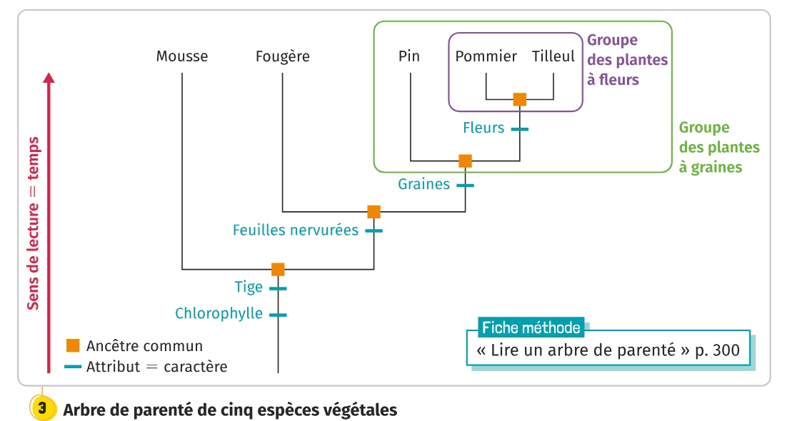 – Il existe un autre type de classification : l’arbre de parenté. Chaque organisme vivant possède tous les caractères présents sur le « chemin » menant de la racine jusqu’à sa branche.